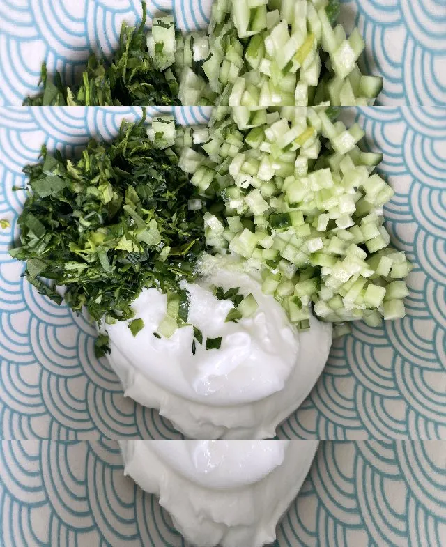 - チーズケーキを焼いている間に、新鮮で香り豊かなソースを作ります。ヨーグルトに刻んだハーブを加え、少々の塩とお好みでレモン果汁を加えます。きゅうりを細かく切ってソースに加えます。にんにく無しのギリシャのザジキのようなものが出来上がります。朝食ですから😉