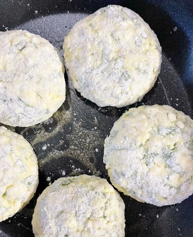 - 各玉を小麦粉にまぶし、少し押しつぶしてから、油を少し塗った温めたフライパンに置きます。